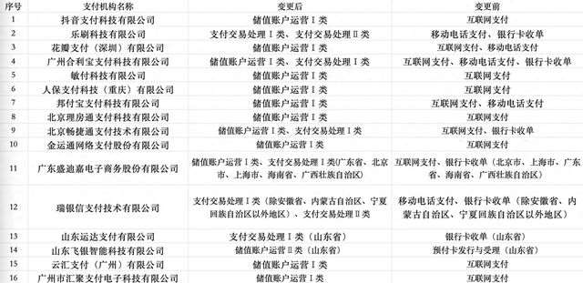 具體來看,這16家支付機(jī)構(gòu)的新版牌照變化如下: