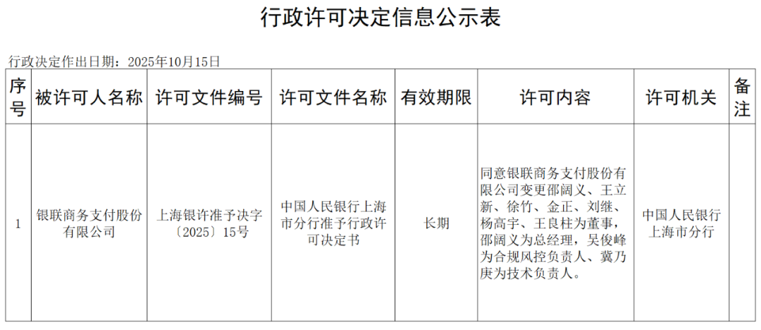 中國人民銀行上海市分行更新行政許可決定信息公示表,許可文件編號“上海銀許準(zhǔn)予決字 〔2025〕15號”顯示,同意銀聯(lián)商務(wù)支付股份有限公司變更邵闊義、王立新、徐竹、金正、劉繼、楊高宇、王良柱為董事,邵闊義為總經(jīng)理,吳俊峰為合規(guī)風(fēng)控負(fù)責(zé)人、冀乃庚為技術(shù)負(fù)責(zé)人。